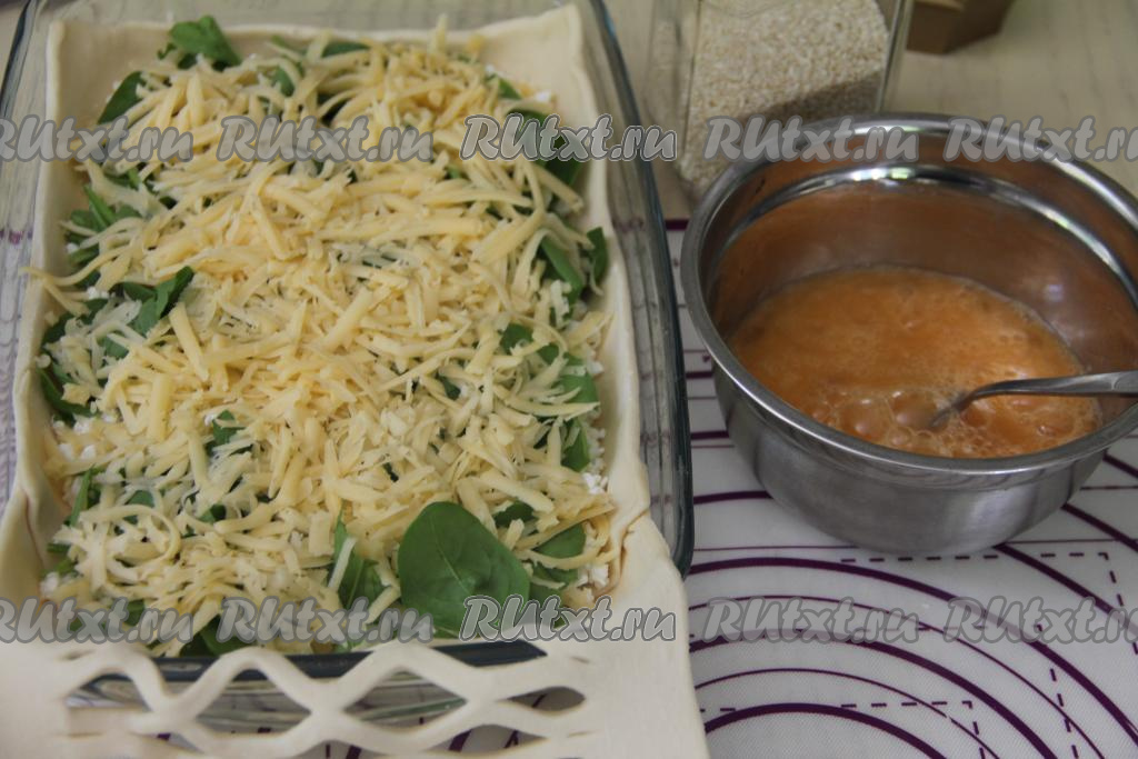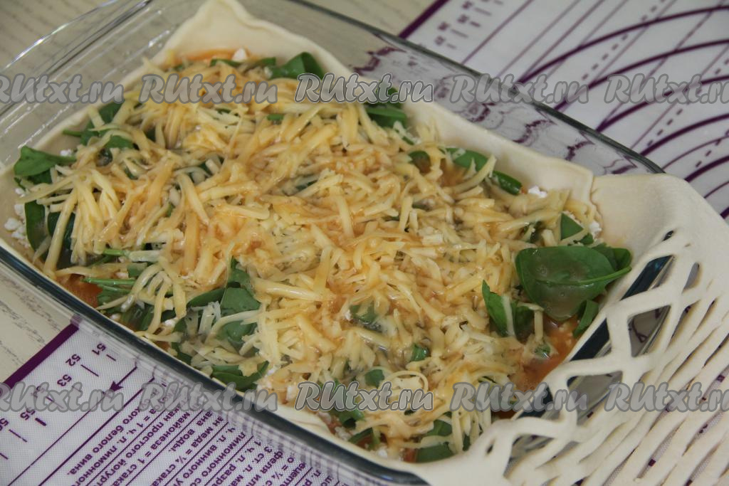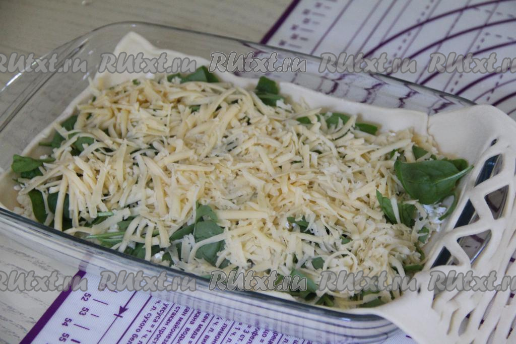 Поверх шпината равномерно разложить сыр, натёртый на крупной тёрке.