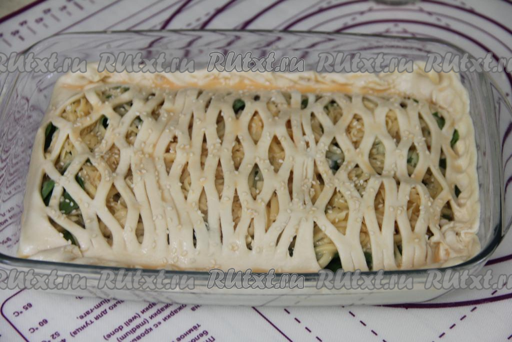Накрыть пирог половиной теста с разрезами и хорошо скрепить края пирога. Взбить вилкой в небольшой ёмкости 1 сырое яйцо. Смазать верх пирога взбитым яйцом и, по желанию, присыпать кунжутом.