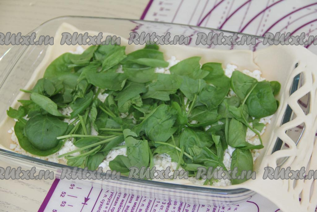 Выложить поверх творога листья шпината.