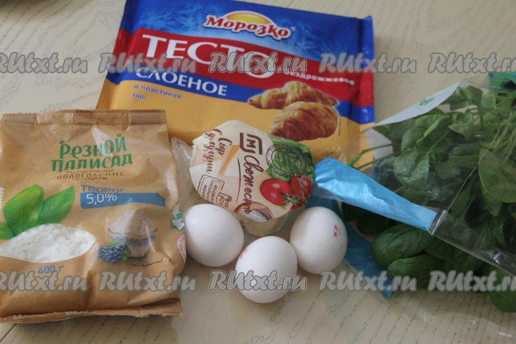Подготовить продукты. Слоёное тесто можно взять как бездрожжевое, так и дрожжевое. Разморозить слоёное тесто при комнатной температуре. Листья шпината промыть водой, обсушить.