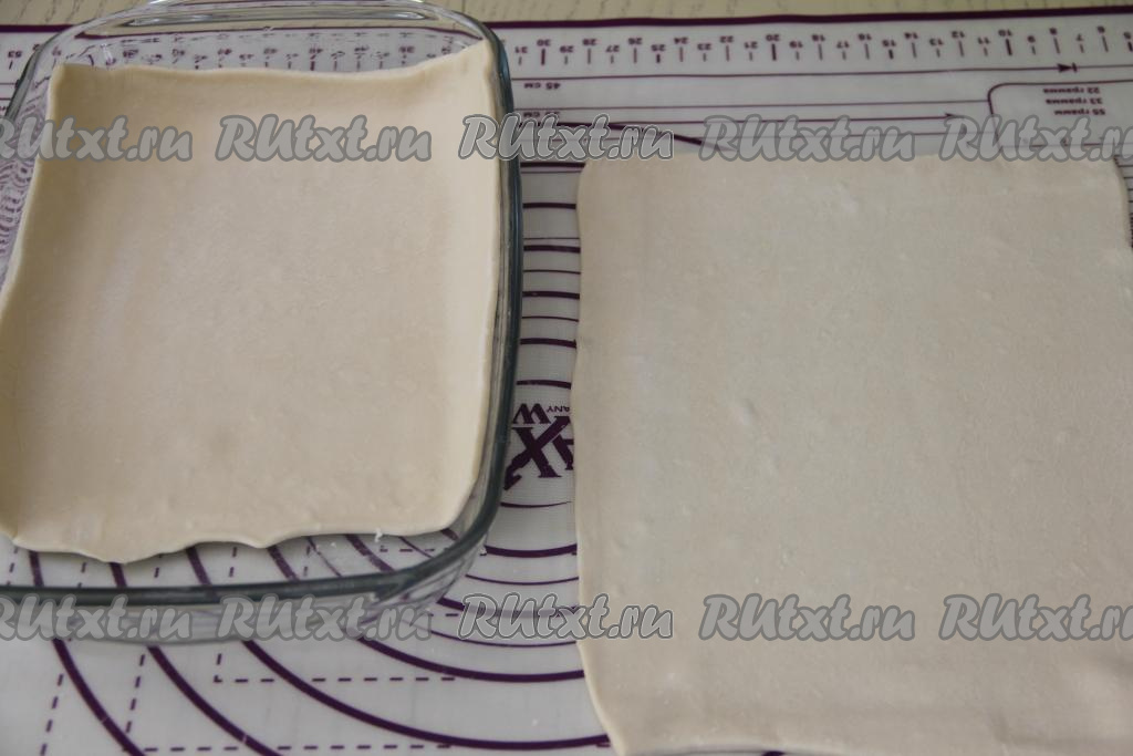 Слоёное тесто у меня было в двух пластах. На припылённой мукой поверхности раскатать каждый разморозившийся пласт теста до толщины примерно 3 миллиметра. Один раскатанный пласт выложить в форму для выпечки (или на противень, застеленный пергаментом), формируя невысокий бортик. Я выложила в форму размером 28 сантиметров на 19 сантиметров.