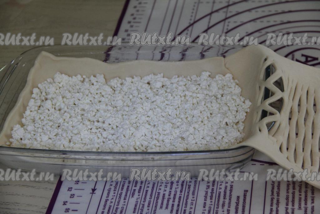 На тесто выложить творог, присолить по вкусу.