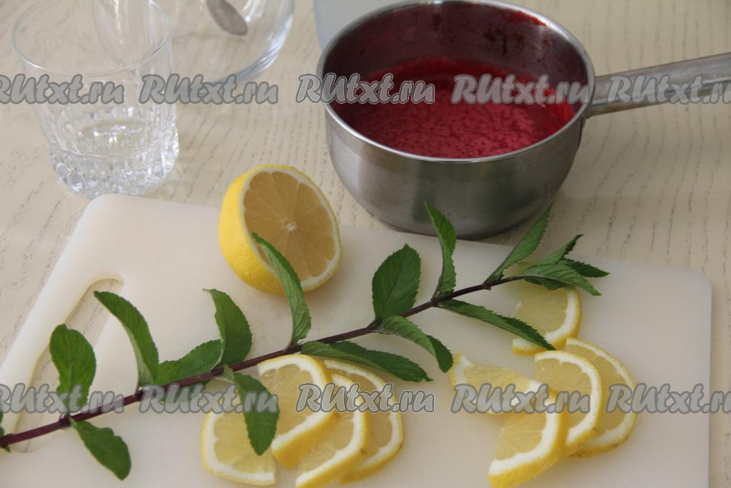 В графин влить ягодный сироп, добавить кубики льда, мяту и ломтики лимона.