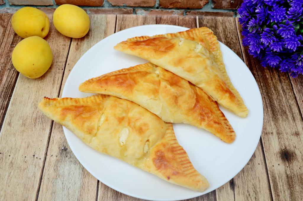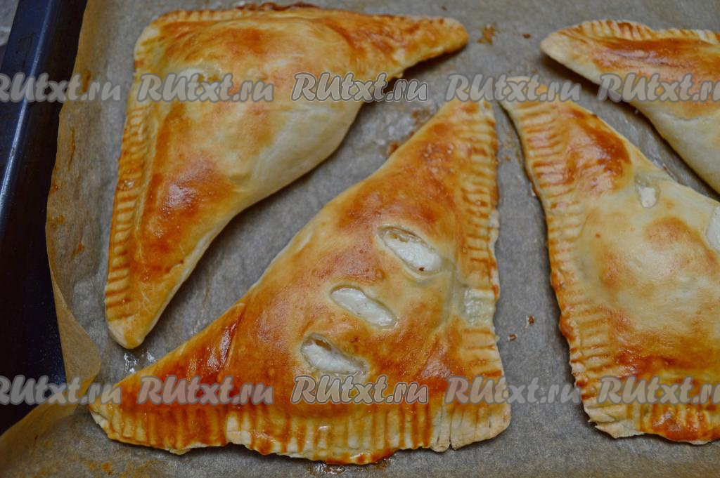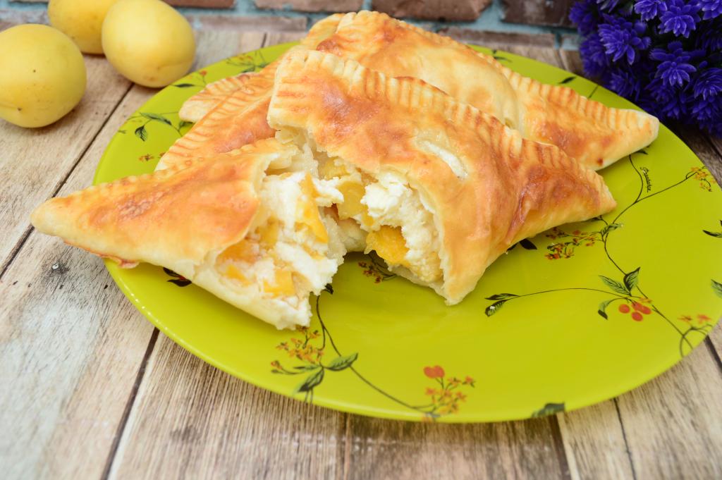 Готовую выпечку достать из духовки. Аппетитные слойки с нежной, сочной начинкой из абрикосов и творога можно есть и тёплыми, и остывшими.