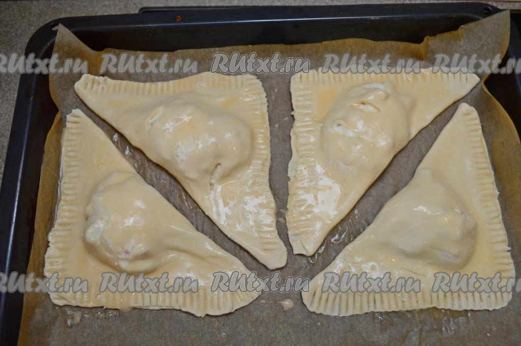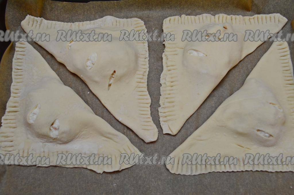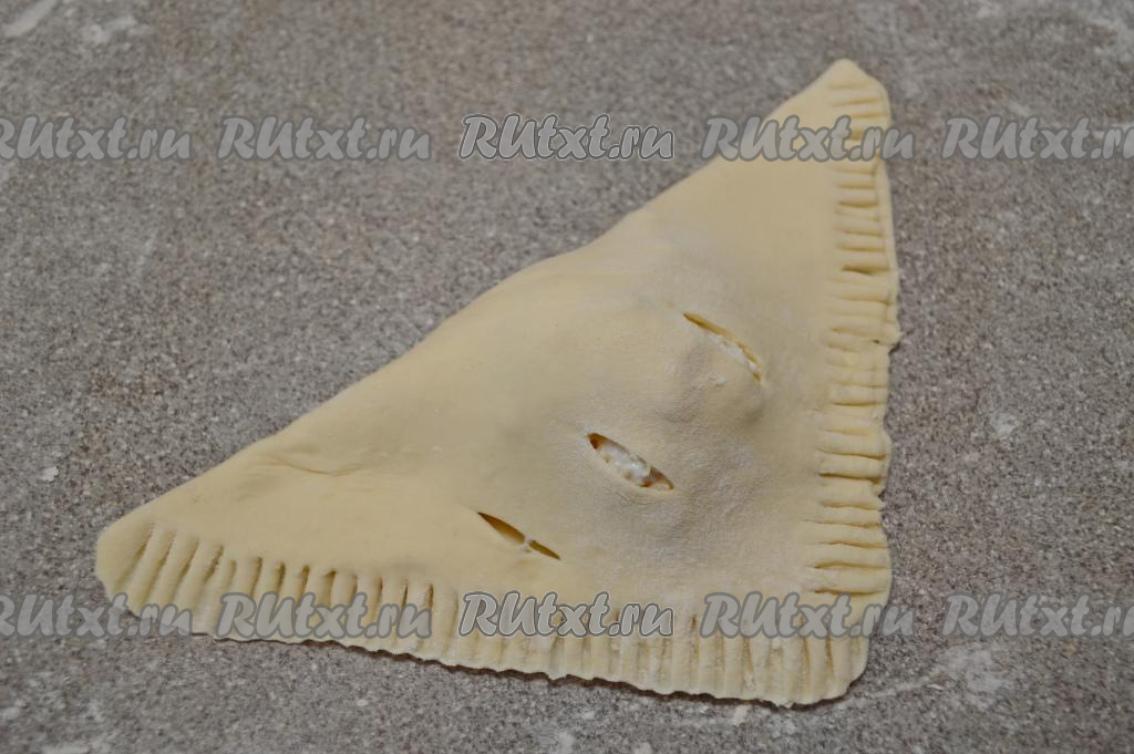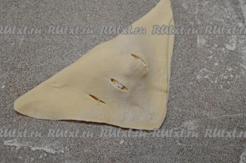 Краем с надрезами накрыть начинку, получится треугольная слойка.