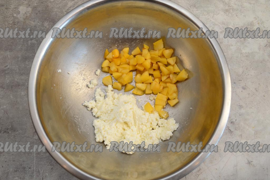 Для получения начинки выложить в миску творог, всыпать сахар, размять вилкой до однородности. Абрикосы разделить на 2 половины, удалить косточки. Затем половинки абрикосов нарезать на небольшие кубики и добавить в миску с творогом, смешанным с сахаром, перемешать вилкой до однородности и начинка для слоек готова.