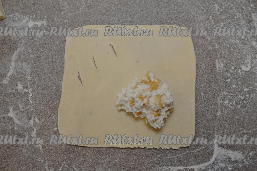 На край теста, противоположный краю теста с надрезами, выложить примерно 1 столовую ложку начинки из творога и абрикосов.