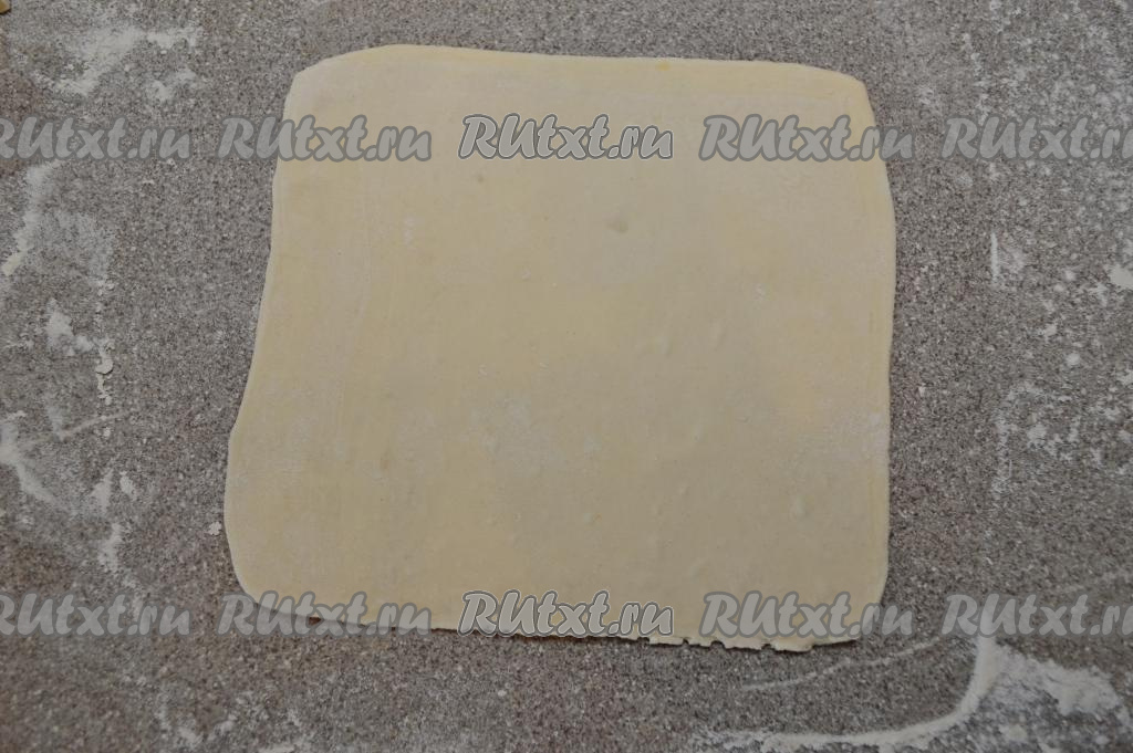 У меня слоёное тесто было в виде квадратного пласта. Разрезать разморозившийся пласт теста на 4 квадрата.