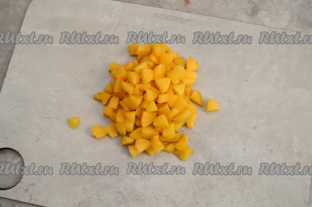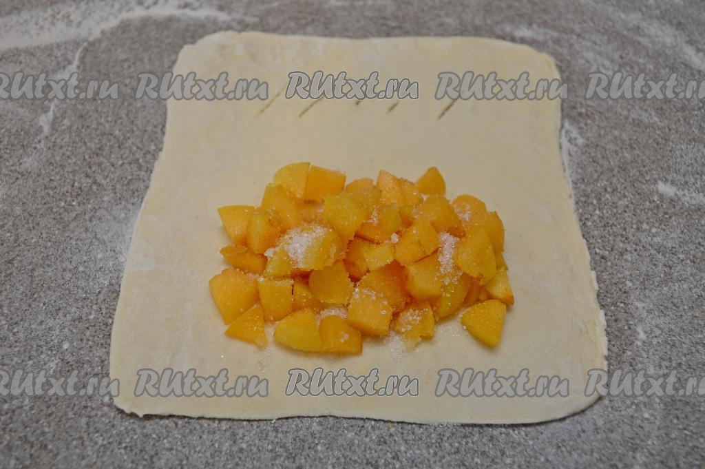 На сторону квадрата, противоположную стороне с разрезами, выложить примерно 1,5 столовых ложки нарезанных абрикосов, отступив от краёв теста по 1,5 сантиметра. Присыпать абрикосы 1 чайной ложкой сахара.