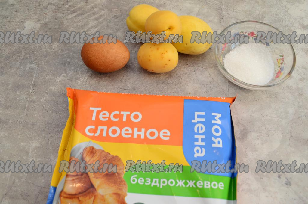 Подготовить продукты. Для этой выпечки прекрасно подойдёт как дрожжевое, так и бездрожжевое слоёное тесто. Я взяла 1 пласт теста весом 250 грамм. Разморозить тесто (оно должно стать достаточно мягким) при комнатной температуре. Вымыть абрикосы, немного обсушить, удалить из них косточки.