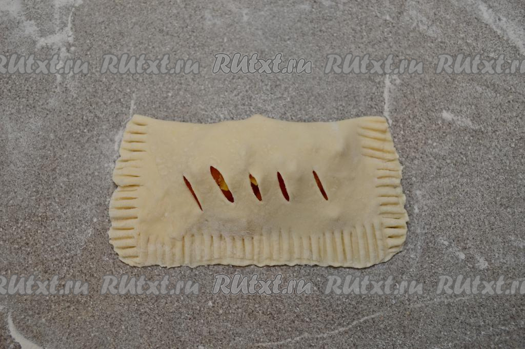 Накрыть абрикосы стороной с надрезами, чтобы получился прямоугольный пирожок.