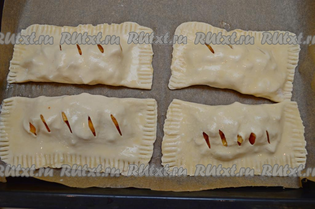 Постепенно из оставшихся заготовок слоёного теста сформировать все 4 пирожка с абрикосами и выложить их на противень.