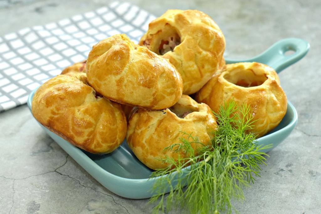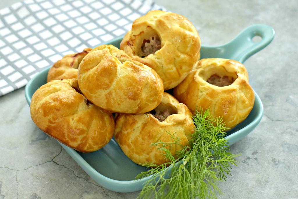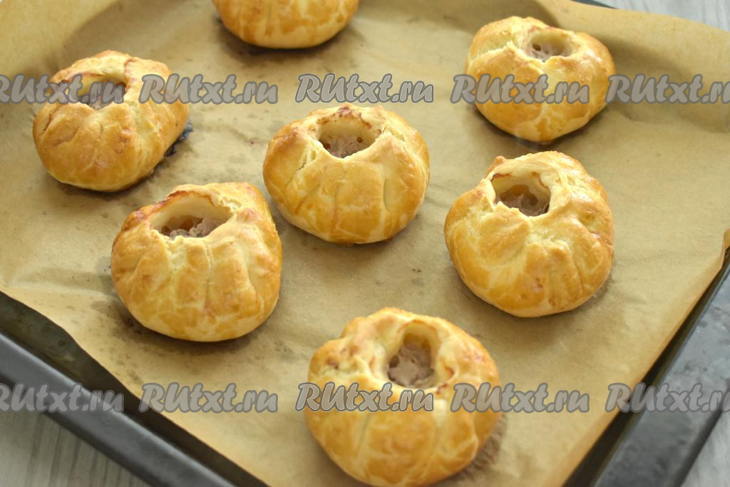 Достаём выпечку из духовки. Вкусные, аппетитные домашние беляши, приготовленные из слоёного теста, к столу подаём горячими или тёплыми.