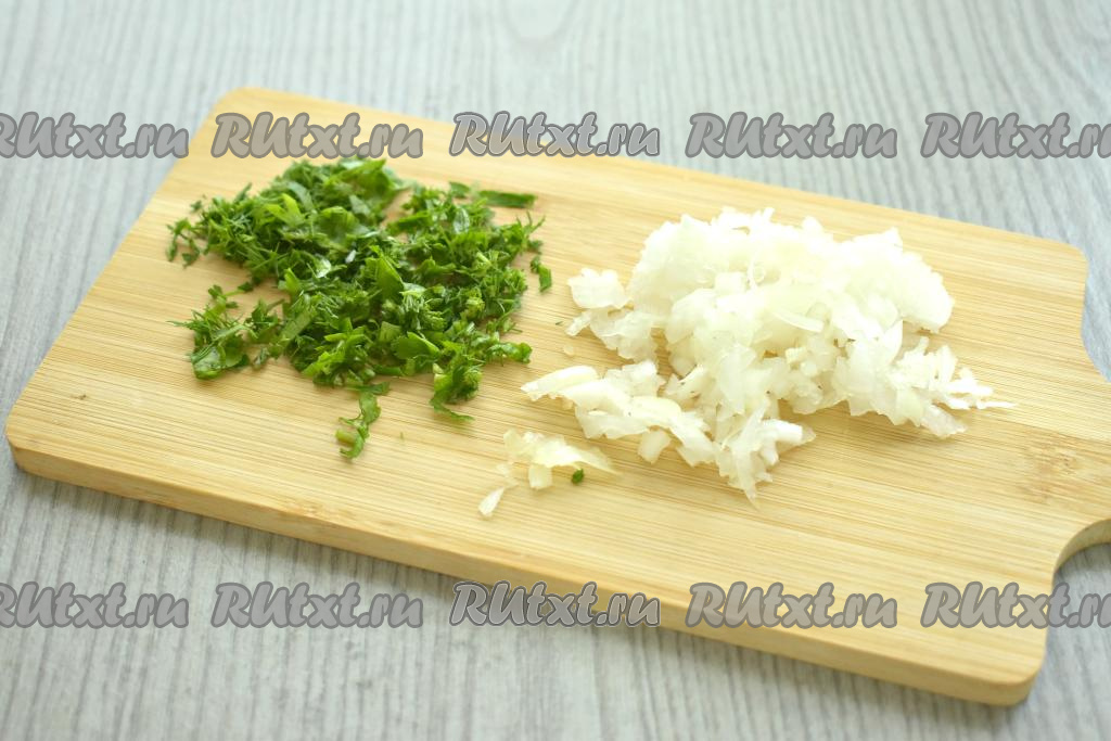 Достаём слоёное тесто из морозилки, оставляем его размораживаться при комнатной температуре. Для приготовления беляшей можно взять как дрожжевое покупное слоёное тесто, так и бездрожжевое. Я в этот раз использовала дрожжевое слоёное тесто. Пока тесто размораживается, займёмся начинкой для беляшей. Для этого очищаем и мелко нарезаем лук. Моем и нарезаем свежую зелень.