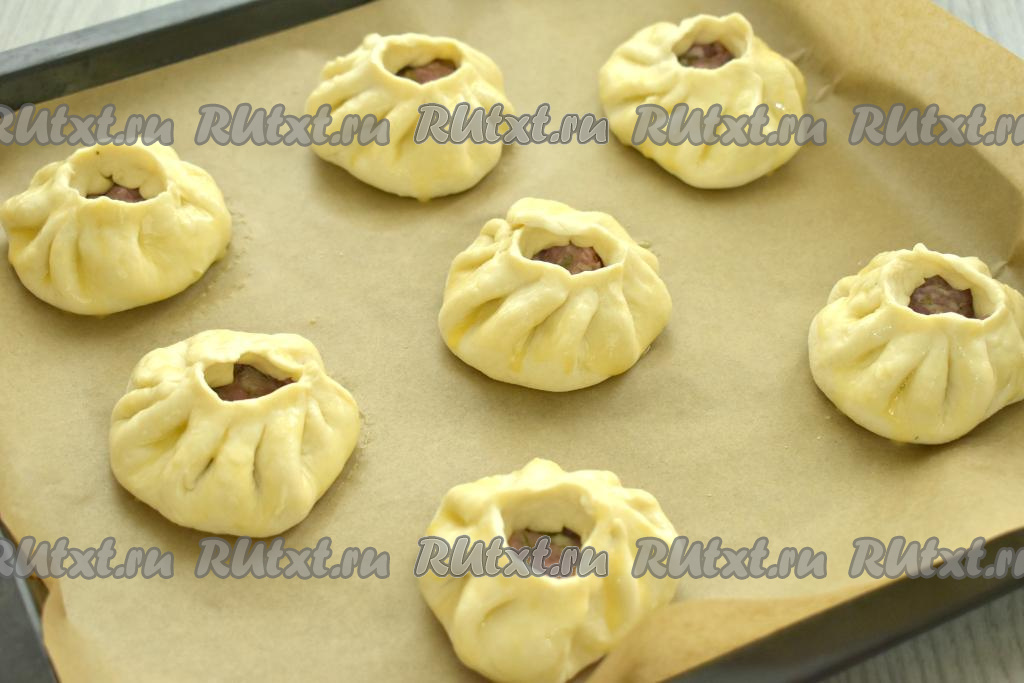 Собираем края лепёшки над начинкой в форме складочек. Беляши из слоёного теста выкладываем на противень, предварительно застеленный пергаментом. Разбиваем в небольшую ёмкость яйцо, взбиваем вилкой до однородности. Смазываем беляши взбитым яйцом.