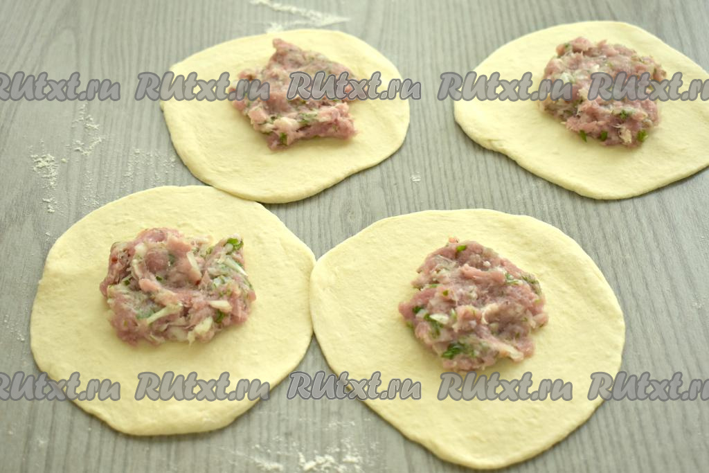 В центр каждой лепёшки выкладываем чуть больше 1 столовой ложки мясного фарша.
