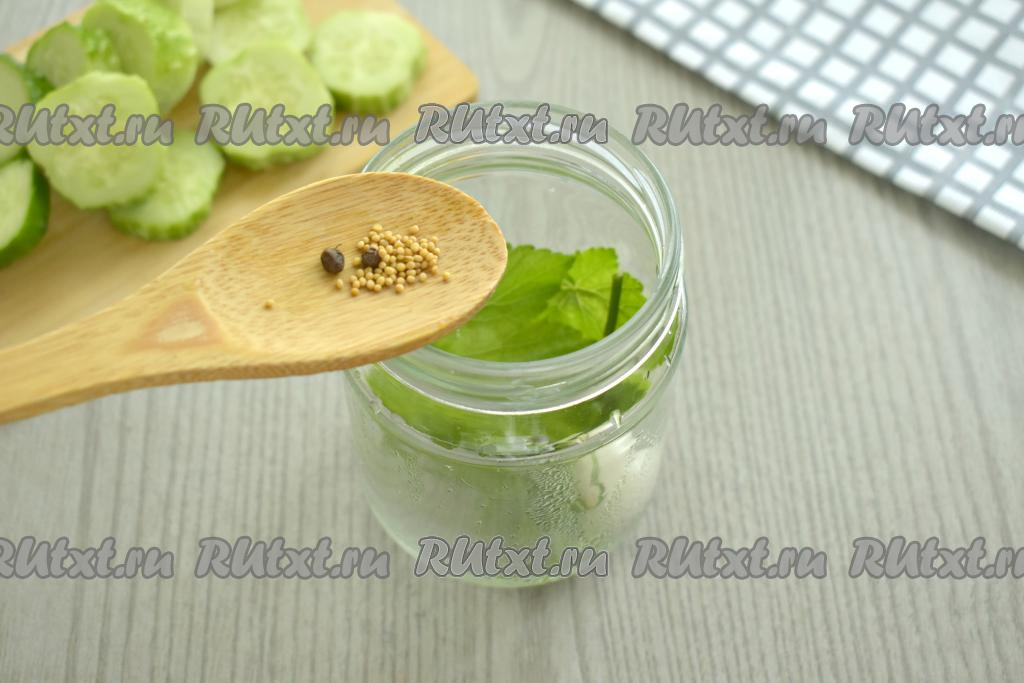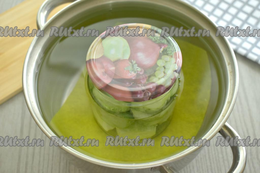 Банку с огурцами прикрываем крышкой, но не закручиваем. На дно кастрюли кладём тканевую салфетку (или тонкое полотенце). Банку с огурцами, прикрытую крышкой, ставим в кастрюлю. Вливаем в кастрюлю горячую воду, чтобы она доходила до плечиков банки. Кастрюлю с банкой с огурцами ставим на средний огонь. После закипания воды в кастрюле стерилизуем банку с огурчиками на небольшом огне 15 минут.