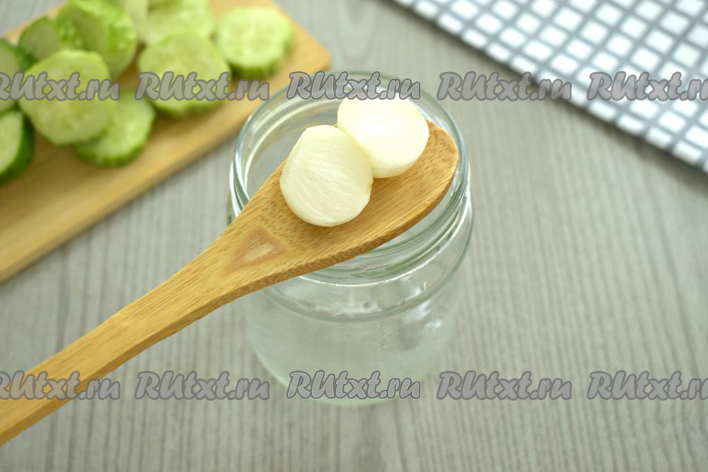Затем огурчики тщательно моем, срезаем кончики с двух сторон. Нарезаем огурцы на кружочки толщиной 1 сантиметр. Очищаем репчатый лук, нарезаем на дольки и выкладываем на дно простерилизованной банки.