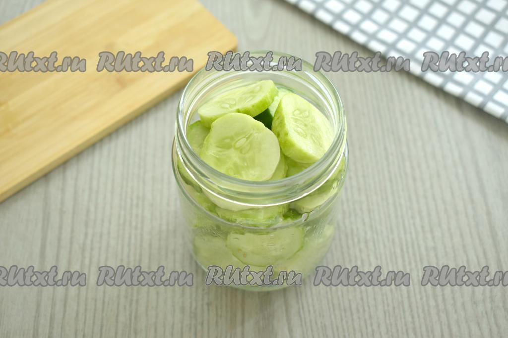 Огурцы, нарезанные на кружочки, выкладываем в банку, но не слишком плотно, чтобы огурчики не поломались.