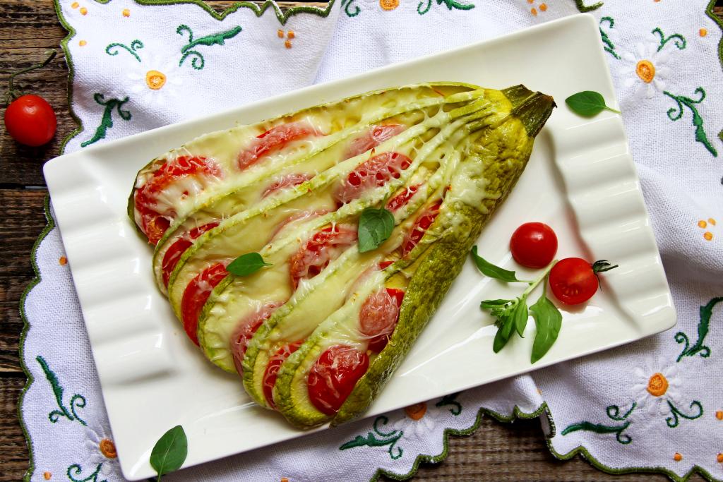 Подготовить продукты. Кабачок нужно выбирать молодой, без крупных семечек. Помидор нужен крепкий, чтобы хорошо разрезался ножом. Кабачок и помидор хорошо вымыть. Если у кабачка тонкая кожура, её можно не срезать.