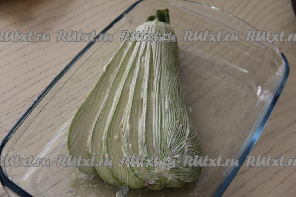 В небольшую ёмкость выложить майонез, добавить очищенный и пропущенный через пресс чеснок, перемешать чесночно-майонезный соус. Полоски кабачкового веера аккуратно посолить. Выложить веер в жаропрочную форму, с помощью силиконовой кисточки смазать все полоски подготовленным чесночно-майонезным соусом.
