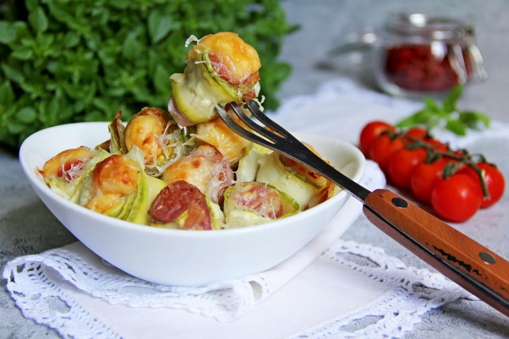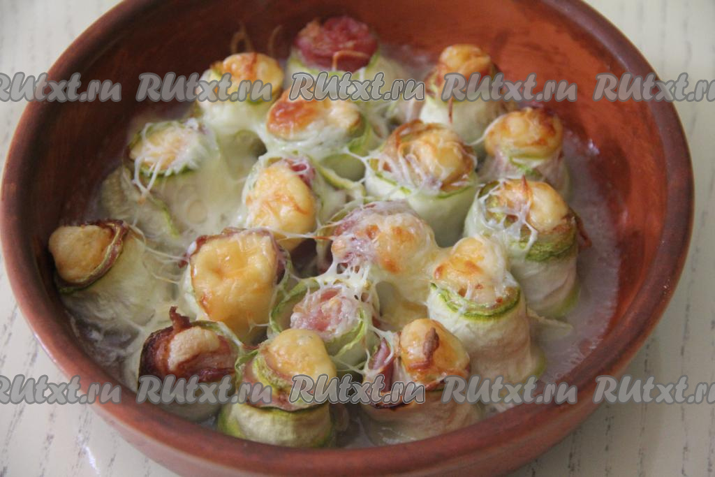 Нежные, вкусные, сочные рулетики, приготовленные из кабачков с беконом и сыром в духовке, горячими подать к столу.