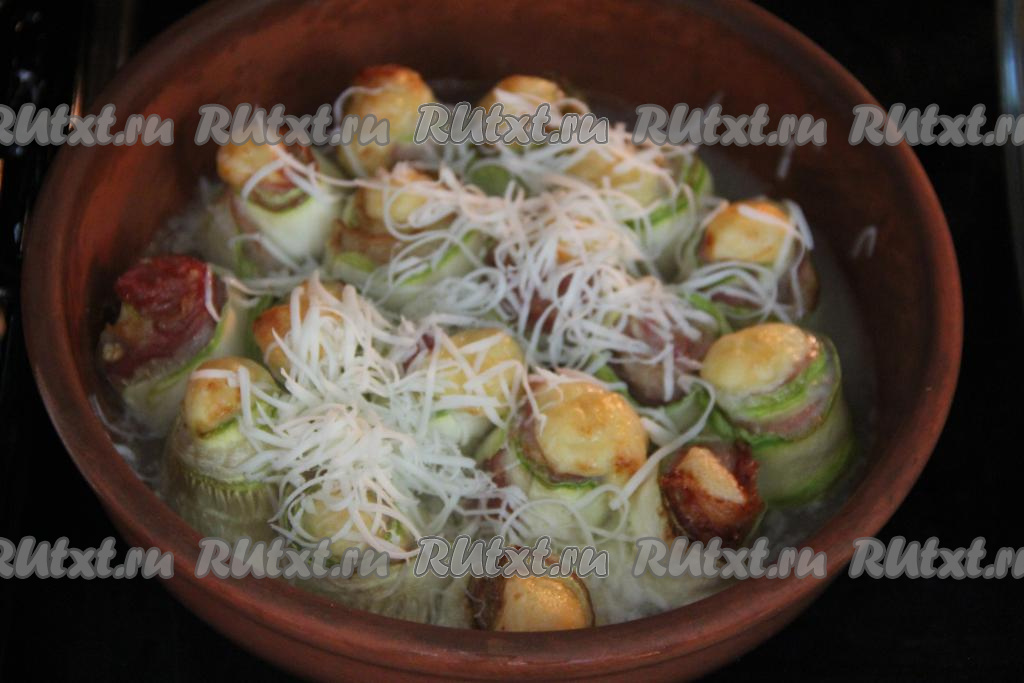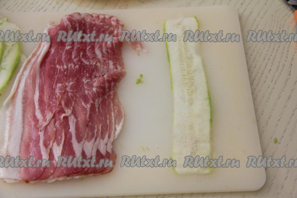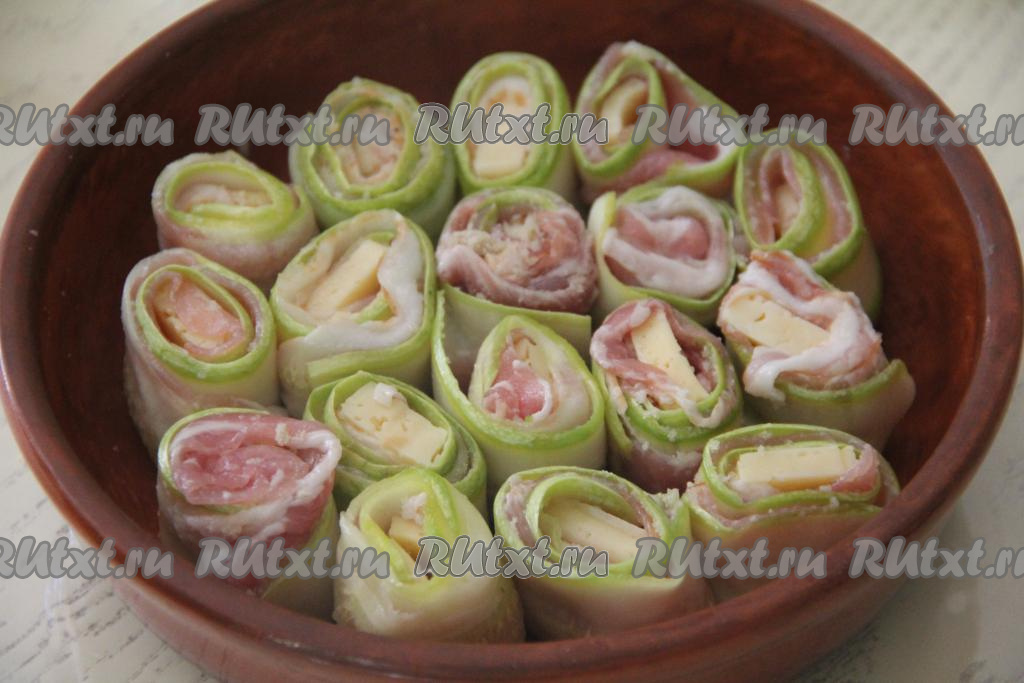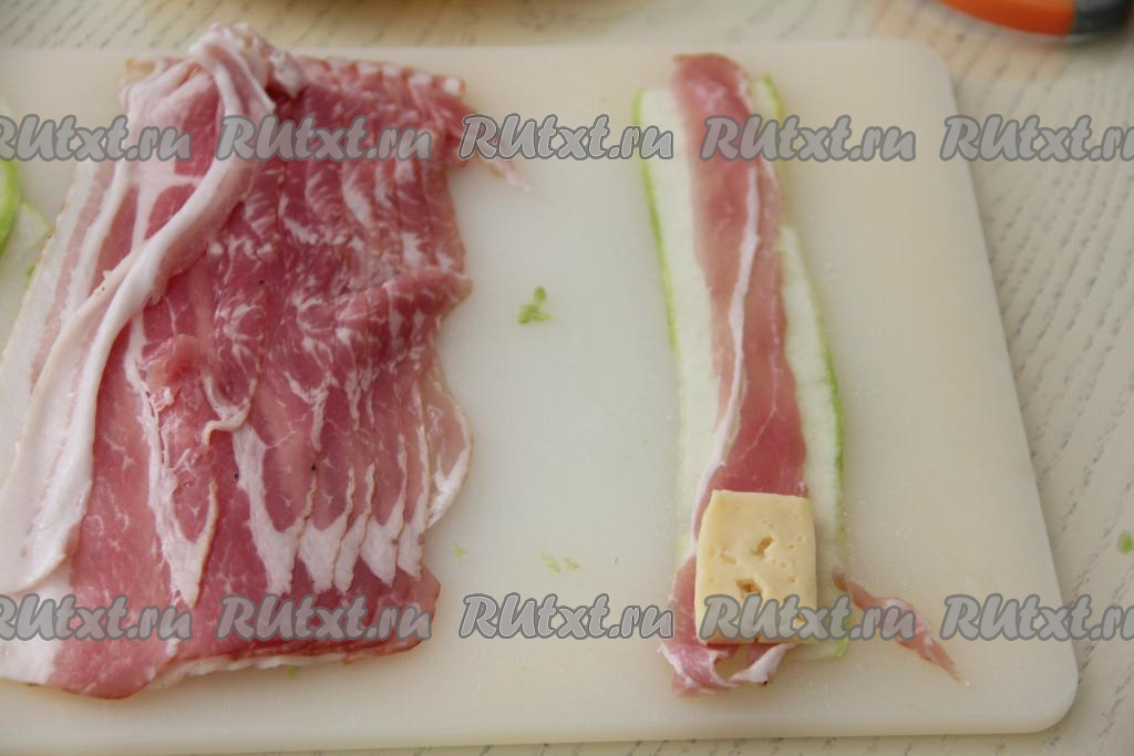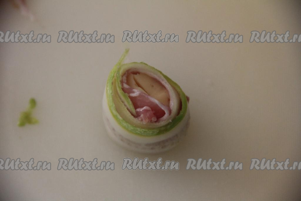 Свернуть кабачок с беконом и сыром в плотный рулетик, начиная со стороны с сыром.