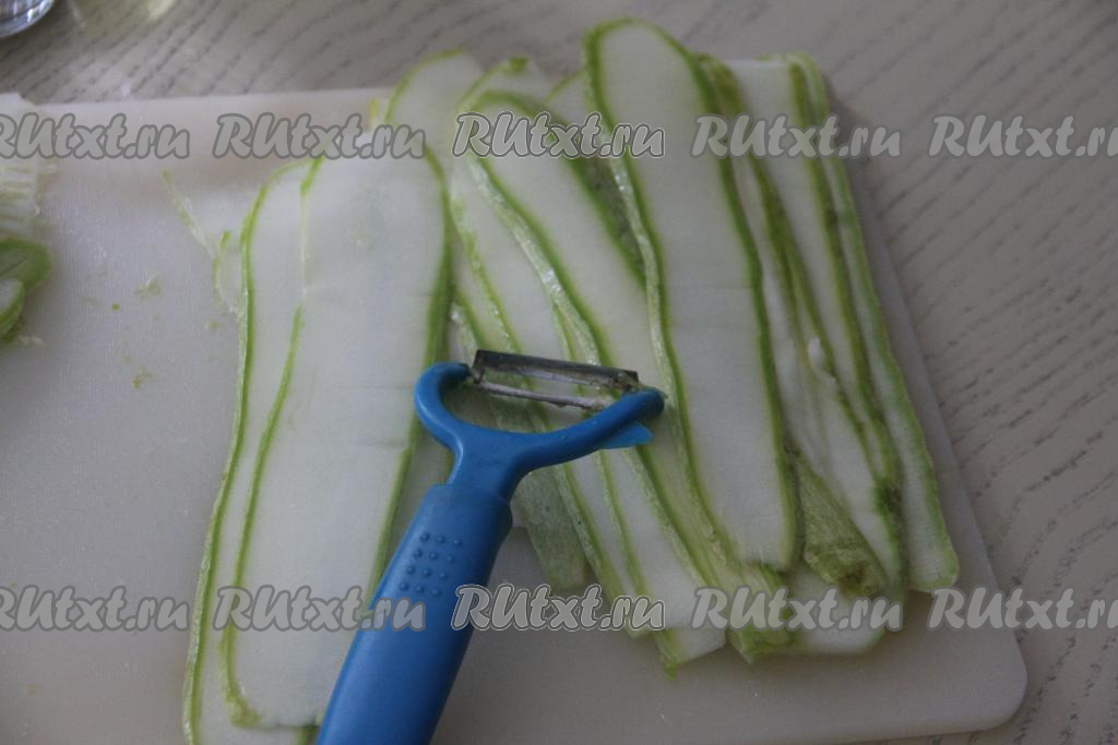 Нарезать кабачок с помощью овощечистки на тонкие и длинные полоски.