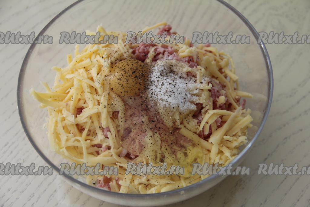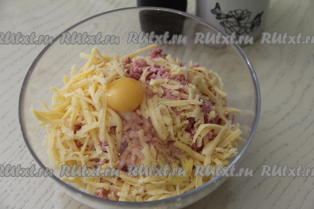 Выложить сыр и ветчину в миску с фаршем и луком, добавить сырое яйцо.