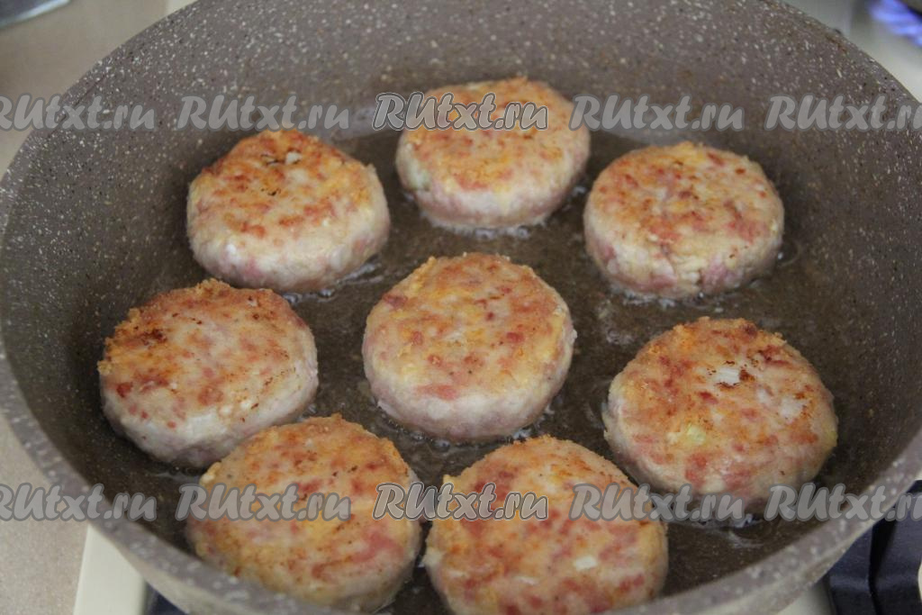 У меня получилось 8 котлет. Сковороду хорошо разогреть с растительным маслом. Выложить котлеты на сковороду и жарить на среднем огне примерно 5-7 минут (до румяной корочки снизу).
