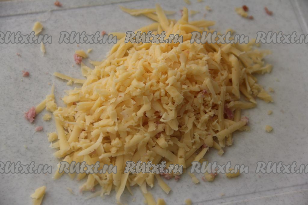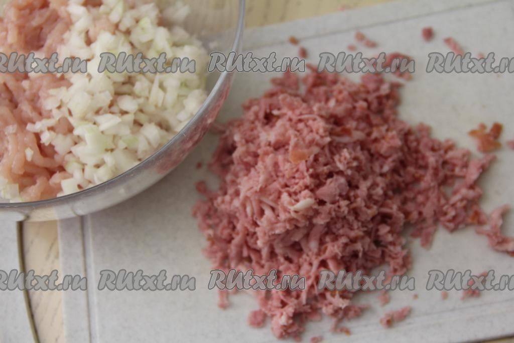 Лук почистить и мелко нарезать. Соединить в миске куриный фарш и лук. Ветчину натереть на крупной тёрке.