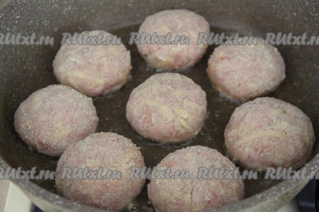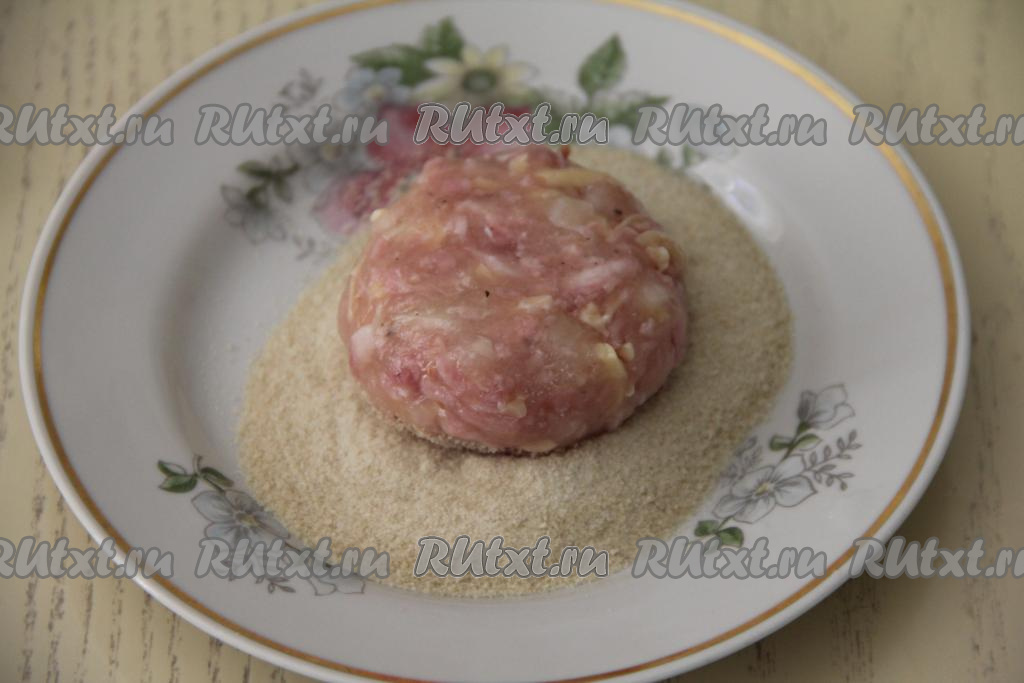 Тщательно вымесить получившийся фарш. Сформировать из этого фарша котлеты любой формы. Обвалять каждую котлету в панировочных сухарях со всех сторон.