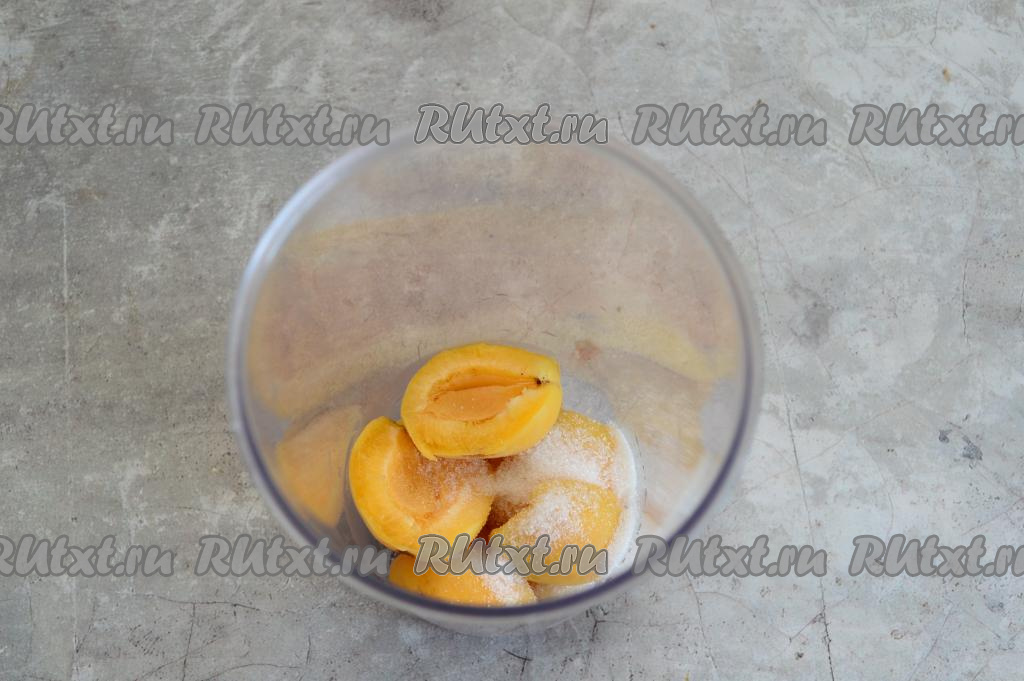 Абрикосы вымыть, удалить косточки. При желании, если абрикосы очень спелые, кожуру можно снять. Я не стала убирать кожуру. Абрикосы, очищенные от косточек, сложить в чашу погружного блендера, всыпать сахар.