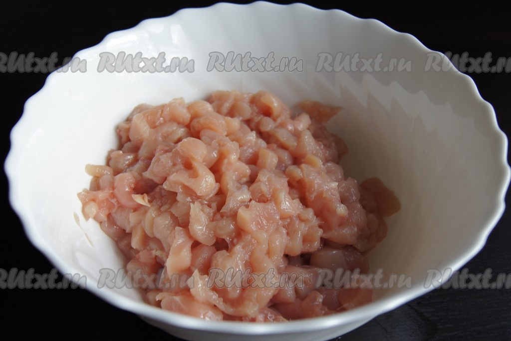 Куриную грудку охладить в морозилке минут 20-30 (тогда ее легче будет резать) и мелко порезать.