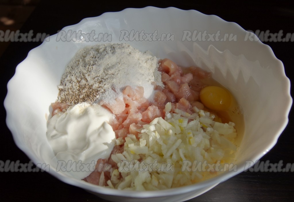 Добавить мелко рубленый лук, муку, яйцо, соль, перец, сметану, все перемешать.