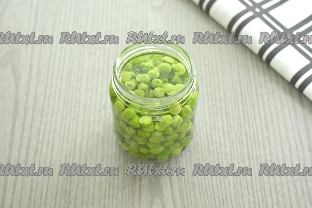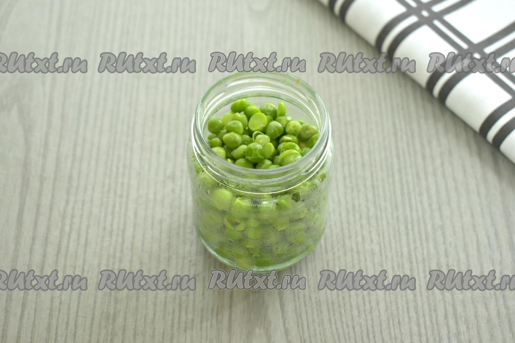 Подготовленный горошек раскладываем по заранее простерилизованным банкам (я раскладывала по 4 банкам объёмом по 250 миллилитров). Заполнять банки горошком нужно чуть ниже плечиков баночек. Прикрыть баночки подготовленными крышками.