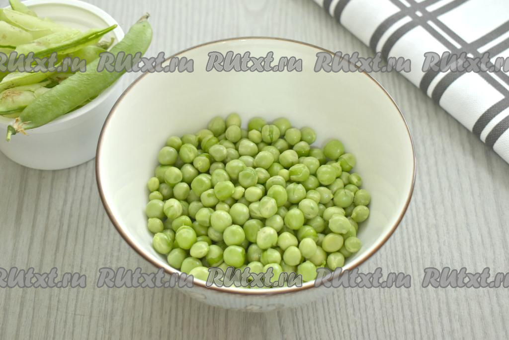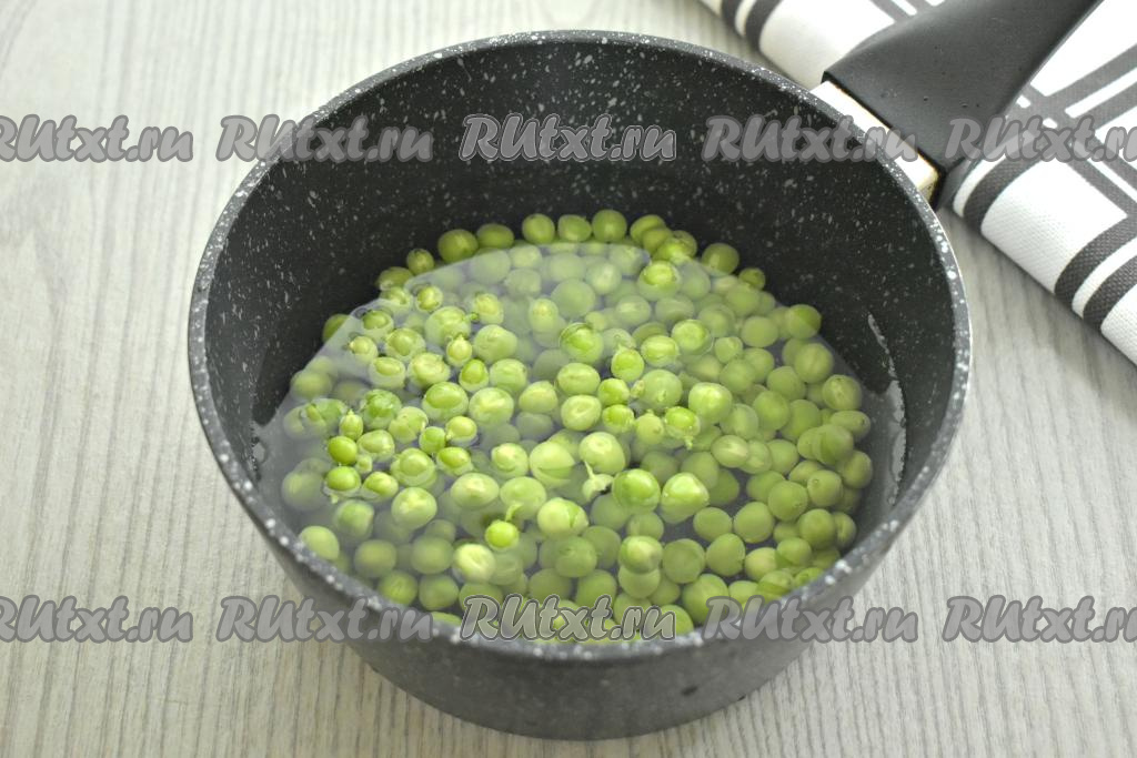 Очищенный горошек перекладываем в кастрюлю, полностью заливаем холодной водой, ставим на огонь. После закипания варим на небольшом огне минут 10 (сорта горошка, степень зрелости могут быть разными, поэтому попробуйте несколько варёных горошин на вкус, они должны стать мягкими, но не переваренными).