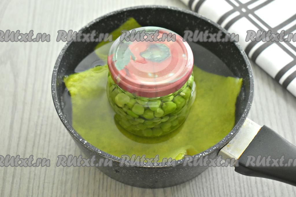 Накрываем банки с горошком прокипячёнными крышками. Берём кастрюлю, на дно кладём полотенце (или салфетку, сложенную в 2-3 раза). Банки с горошком ставим в кастрюлю. Благодаря тому, что банки стоят на полотенце (или на салфетке), они не будут касаться дна кастрюли, а значит они не лопнут в процессе дальнейшей стерилизации. В кастрюлю с банками с горошком вливаем горячую воду, которая должна доходить до "плечиков" банок. Кастрюлю ставим на средний огонь. После того как вода в кастрюле закипит, стерилизуем банки с горошком на небольшом огне 20 минут.