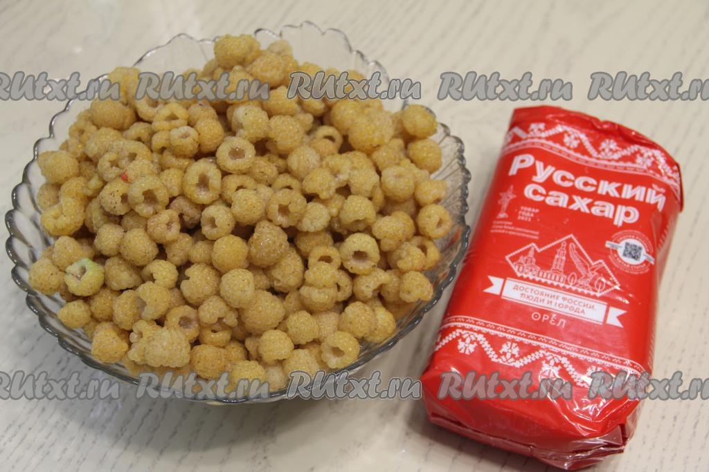 Подготовить продукты. Жёлтую малину перебрать, убирая плодоножки. 1 килограмм подготовленных ягод выложить в дуршлаг, промыть водой, дать малине немного обсохнуть.