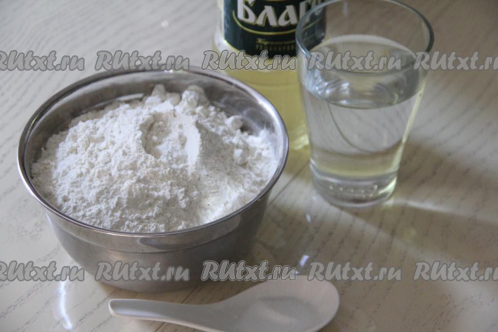 В глубокую миску всыпать 400 грамм просеянной муки, добавить соль, влить воду комнатной температуры.