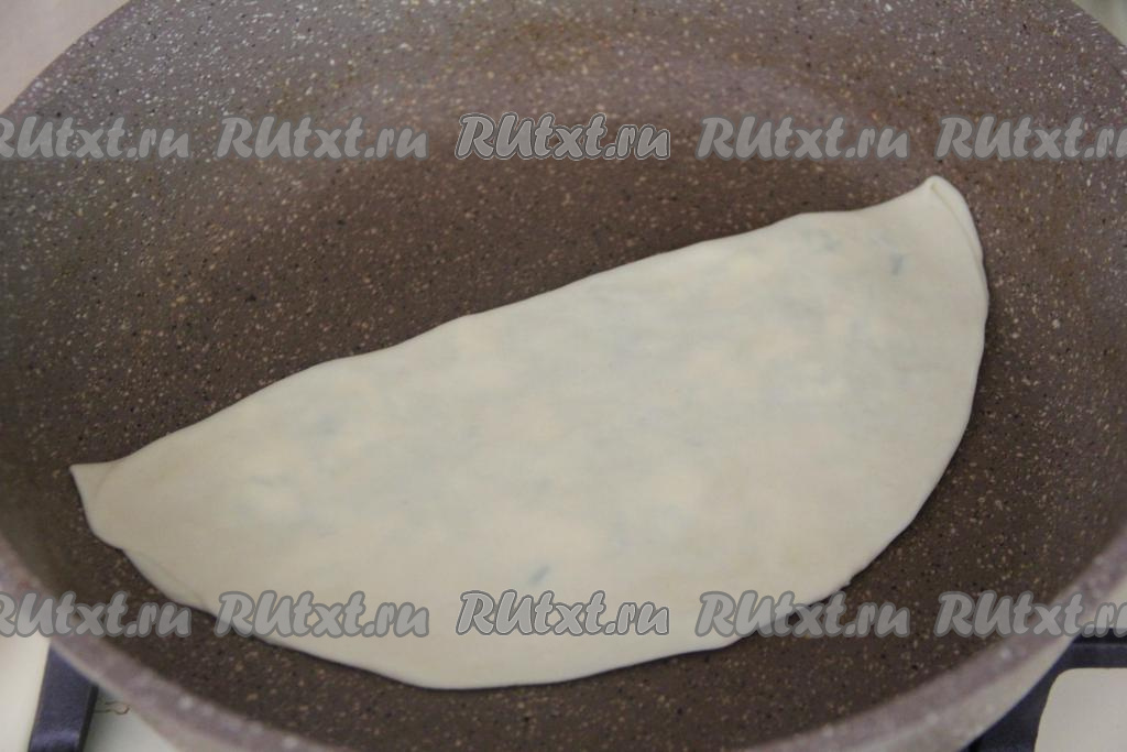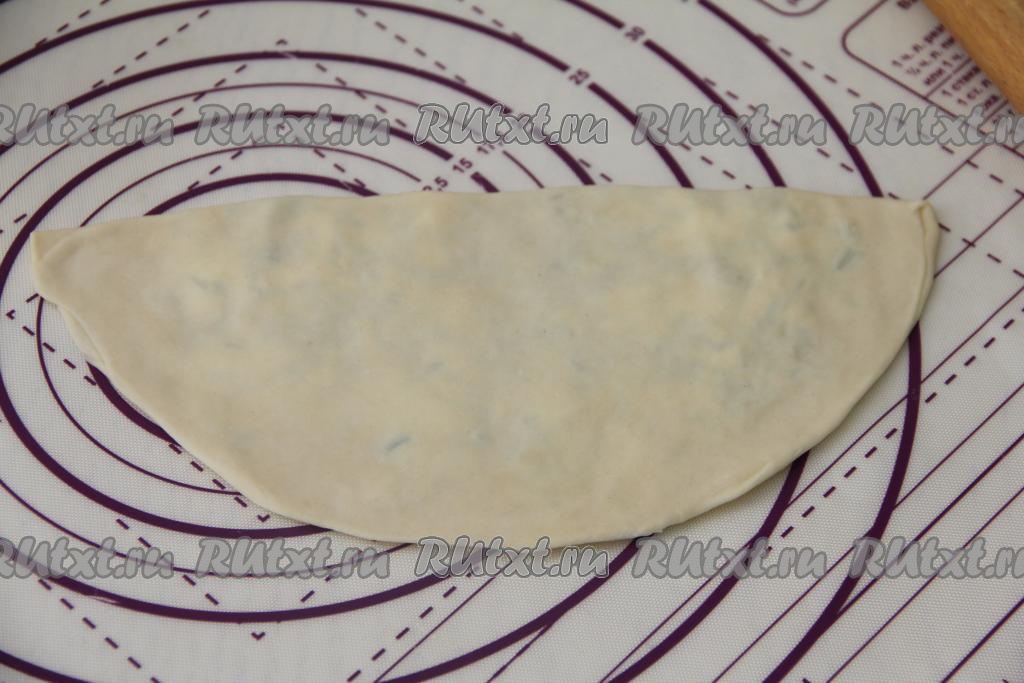 Сторону круга с начинкой накрыть чистой половиной круга, хорошо скрепить края теста, получится заготовка полукруглой лепёшки с творогом и зеленью. Слегка раскатать скалкой получившуюся лепёшку, она должна быть тонкой.