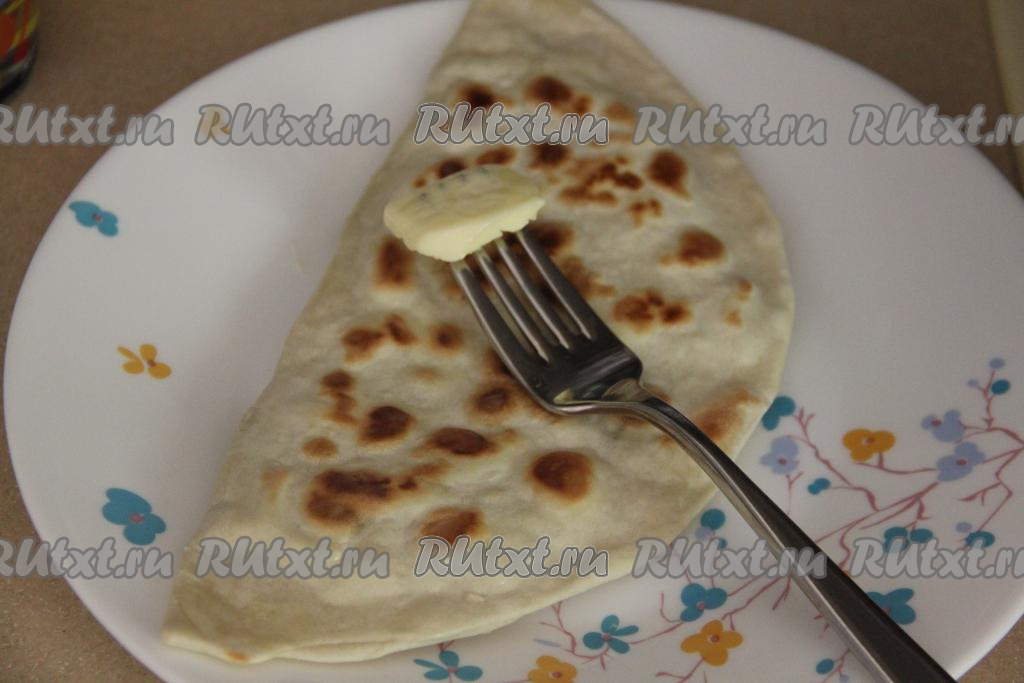 Готовую лепёшку с творогом и зеленью переложить со сковороды на тарелку, сразу смазать сливочным маслом с двух сторон. Таким образом приготовить все тонкие турецкие лепёшки.