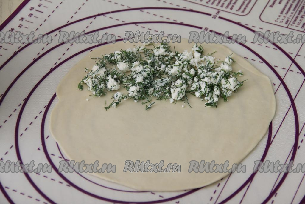 Каждую часть теста на присыпанной мукой поверхности раскатать скалкой в тонкий круг диаметром примерно 28 сантиметров. Зрительно разделить начинку на 10 равных частей. На одну половину раскатанного круга, немного отступив от края, выложить одну часть начинки.