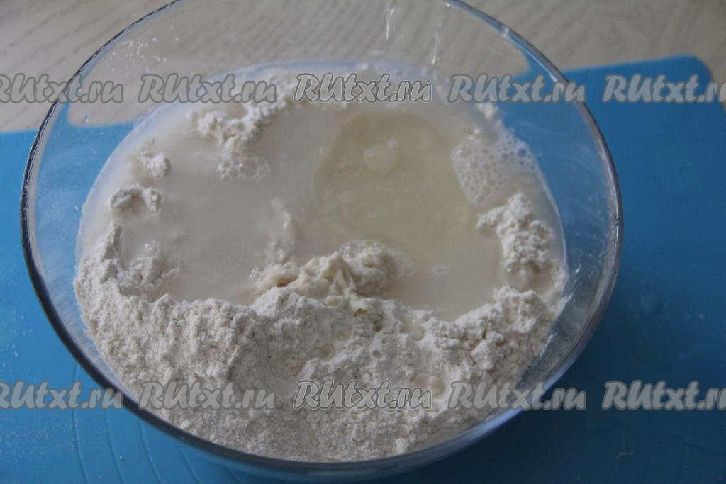 Влить растительное масло, перемешать столовой ложкой до однородности. А затем частями добавляя оставшуюся просеянную муку, замесить пластичное, не липнущее к рукам тесто.