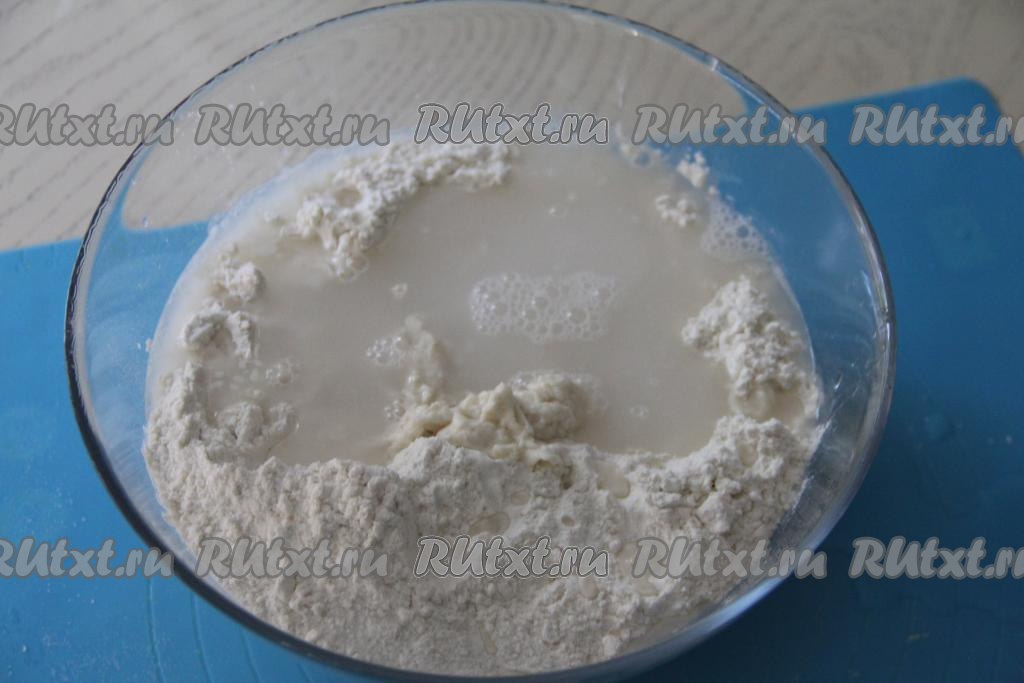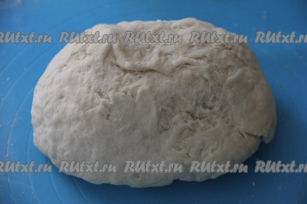 Замешанное тесто вымесить в течение 5 минут, затем накрыть плёнкой и оставить на столе, при комнатной температуре, на 30 минут.
