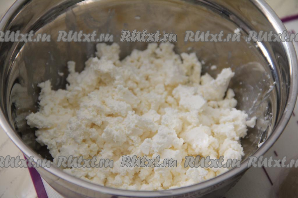 Готовое тесто разделить на 10 равных частей. Творог можно взять любой жирности и консистенции, выложить его в глубокую миску.