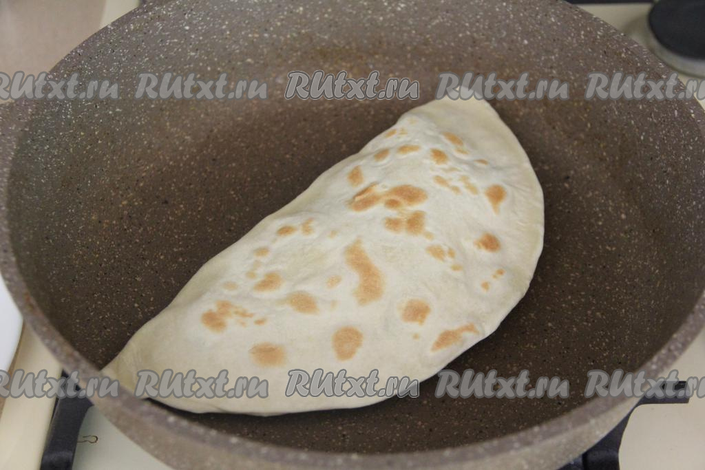 Сухую сковороду (без масла) хорошо разогреть. Затем выложить лепёшку на разогревшуюся сковороду.