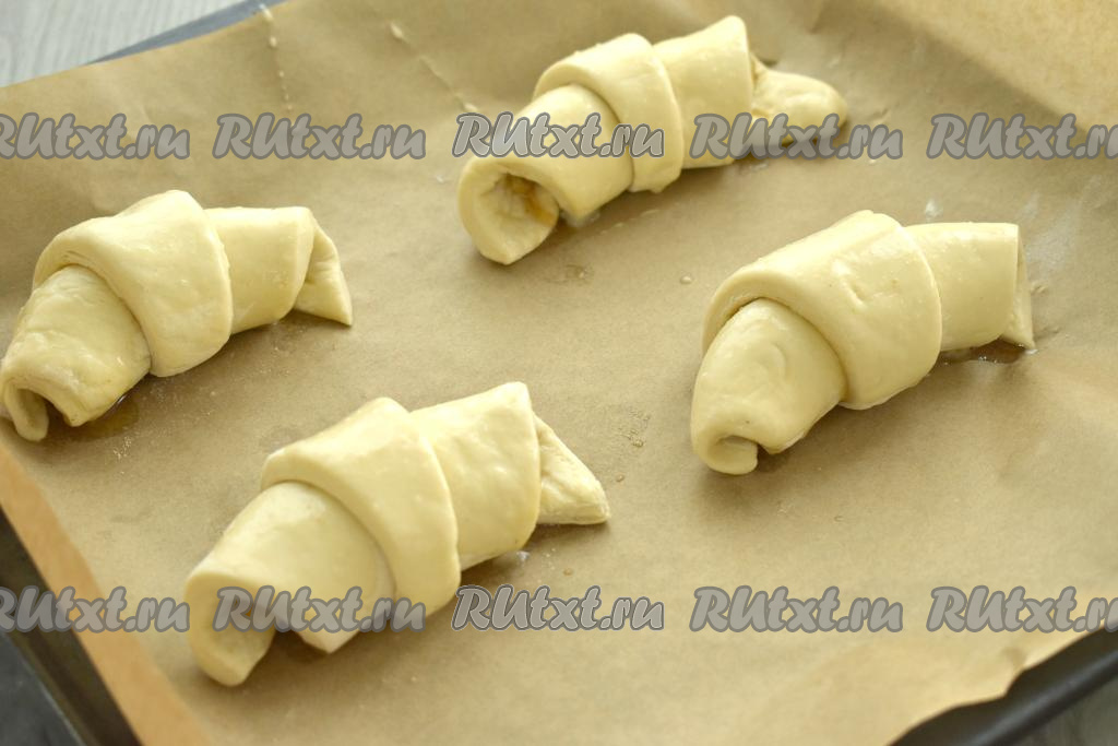 Начиная со стороны с яблочной начинкой, сворачиваем каждый треугольник в рулетик. На противень, застеленный пергаментом, выкладываем сформированные круассаны так, чтобы "кончик" теста оказался внизу. Яйцо в небольшой ёмкости взбиваем вилкой. Смазываем каждый круассан с яблоками взбитым яйцом.