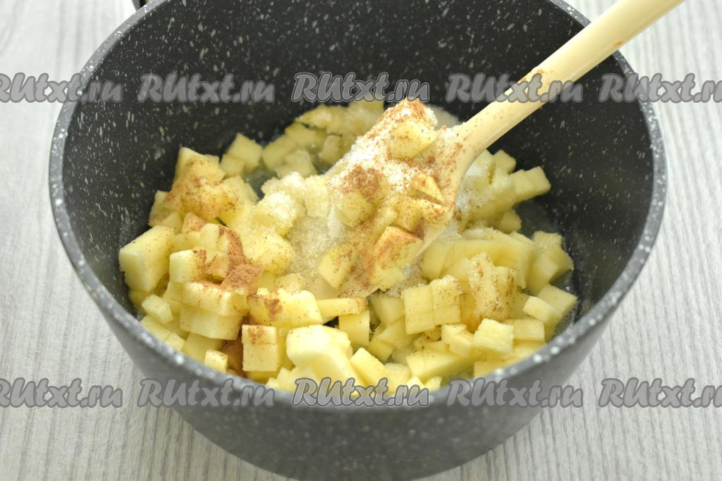 В растопленное сливочное масло добавляем кусочки яблока, всыпаем сахар и корицу, перемешиваем и тушим на огне чуть ниже среднего примерно 7 минут (до мягкости яблок). Снимаем яблоки с огня, даём остыть и начинка для круассанов готова.