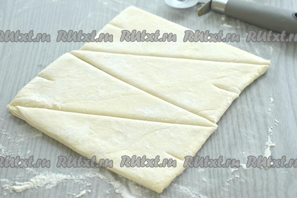 Размороженный пласт теста выкладываем на стол, присыпанный мукой. Разрезаем пласт теста пополам. Затем каждую половину теста разрезаем по диагонали. В итоге получается 4 треугольных заготовки для круассанов. С узкой стороны каждого треугольника по середине делаем небольшой надрез, как на фото.